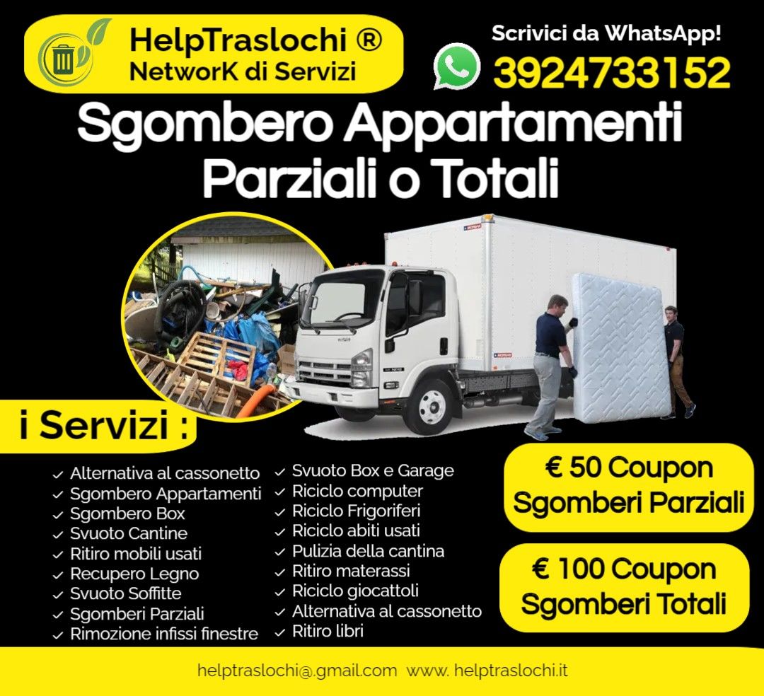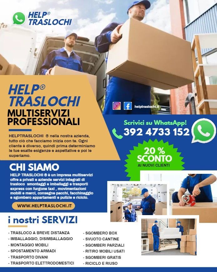 HELP Traslochi ® Chiamaci Ora! Prenota multiservizi per semplificare le operazioni di trasloco a breve distanza e piccoli trasporti su Roma scrivici su WhatsApp al Tel 3333855833 Rispondiamo in tempi rapidi per lo spostamento merci e mobili e sgombero appartamenti con il ritiro dei mobili usati, offriamo ai clienti servizi servizio per liberare la casa e il box , da tutto quello che è ingombrante come il vecchio mobilio di una volta costruiti in unico blocco, per questa particolare qualità prodotti per durare nel tempo, per la rimozione servono operazioni di smontaggio e smantellamento che richiedono attenzione.